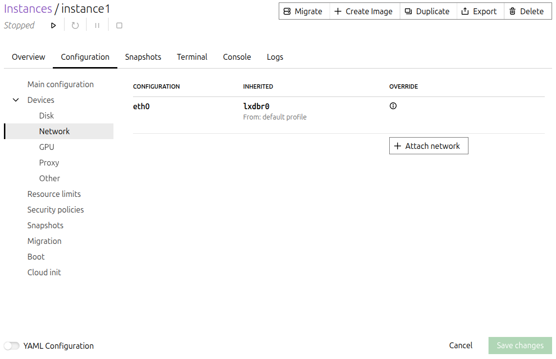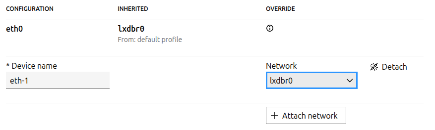 The lxc network attach command is a shortcut for adding a NIC device to an instance. Alternatively, you can add a NIC device based on the network configuration in the usual way: