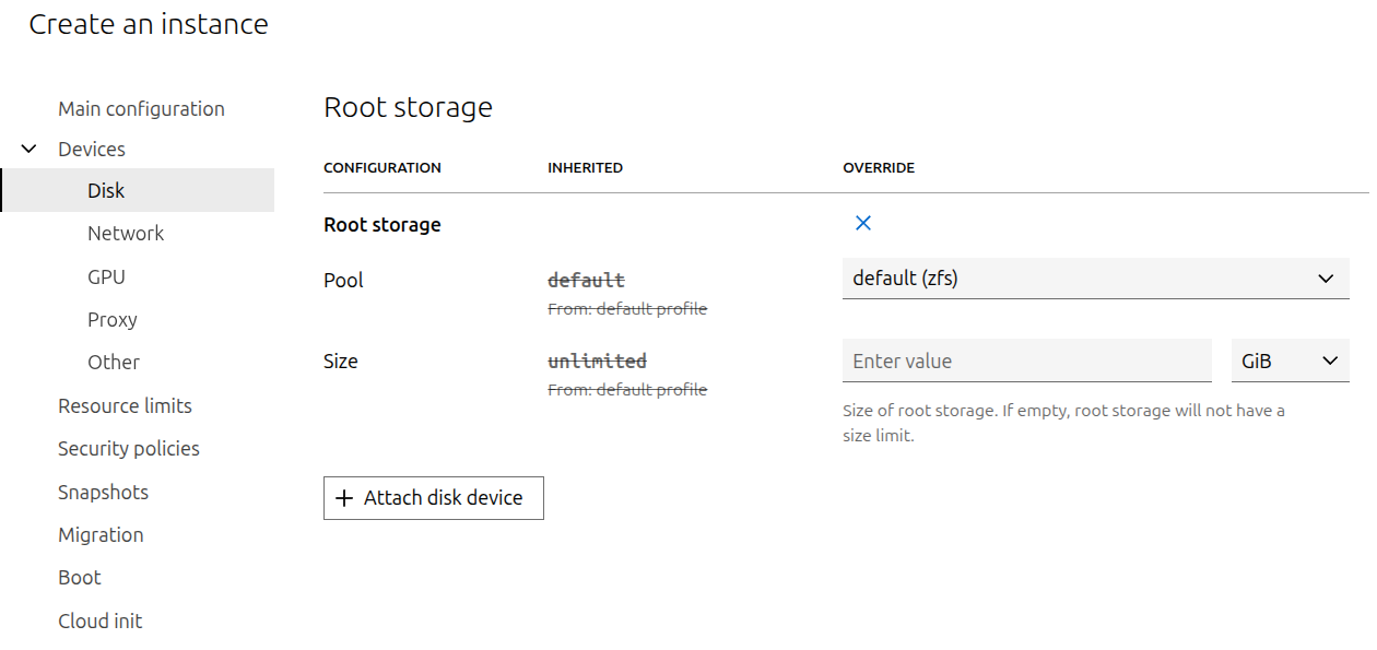 From here, you can override the pool and size of the root storage by editing their respective fields.