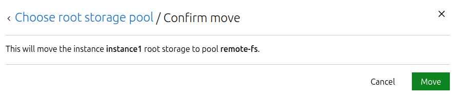 Within the move modal, click Move instance root storage to a different pool to view available storage pools to move to.